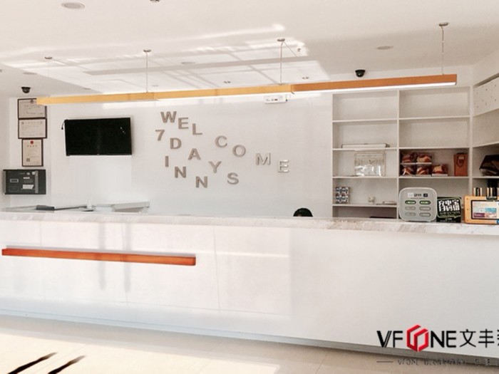 深圳酒店裝修       “WELCOME 7DAYSINN”15個(gè)不銹鋼字體,硅藻泥飾面的背景墻,干凈透亮。酒店前臺(tái)裝修設(shè)計(jì) 使用高密度純白色人造石材,白色PVC護(hù)膜飾面,干凈敞亮,便于清潔。 入住旅客的下午茶歇腳站,便利與情調(diào)并存。