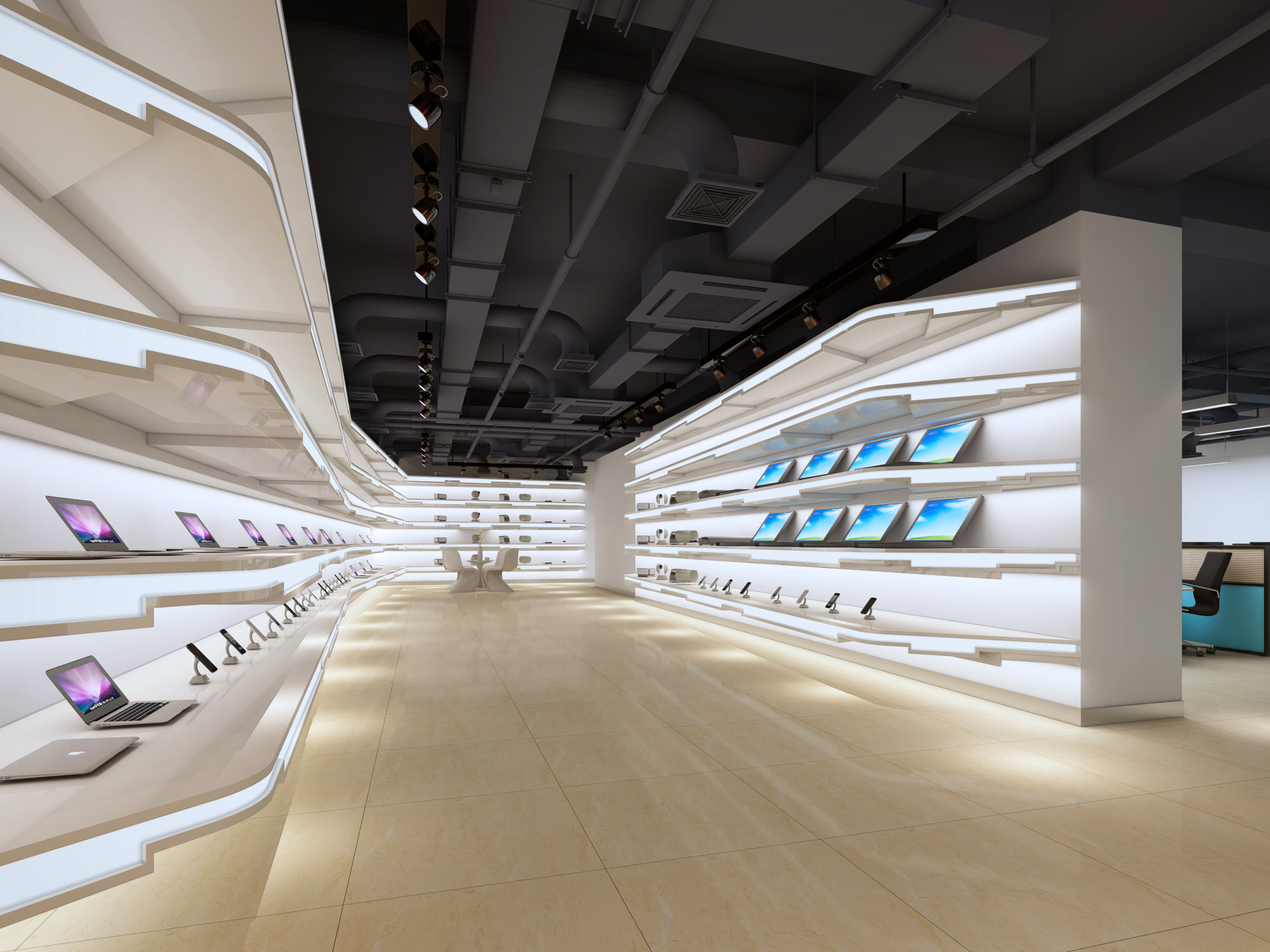 隱藏式的嵌入照燈主要以烘托氛圍感為主,為展廳提供間接照明。燈光也是展廳內(nèi)一大重要因素,柔和的光源在素凈色調(diào)的空間中,微微洗亮潔凈的純白色,映襯出電子產(chǎn)品獨有的智能科技屬性,同時平衡了一絲溫潤感。這不僅僅只是室內(nèi)的簡單照明,更擁有著營造氣氛、塑造形色、增加空間層次的重要作用。